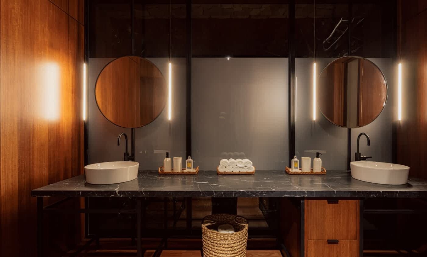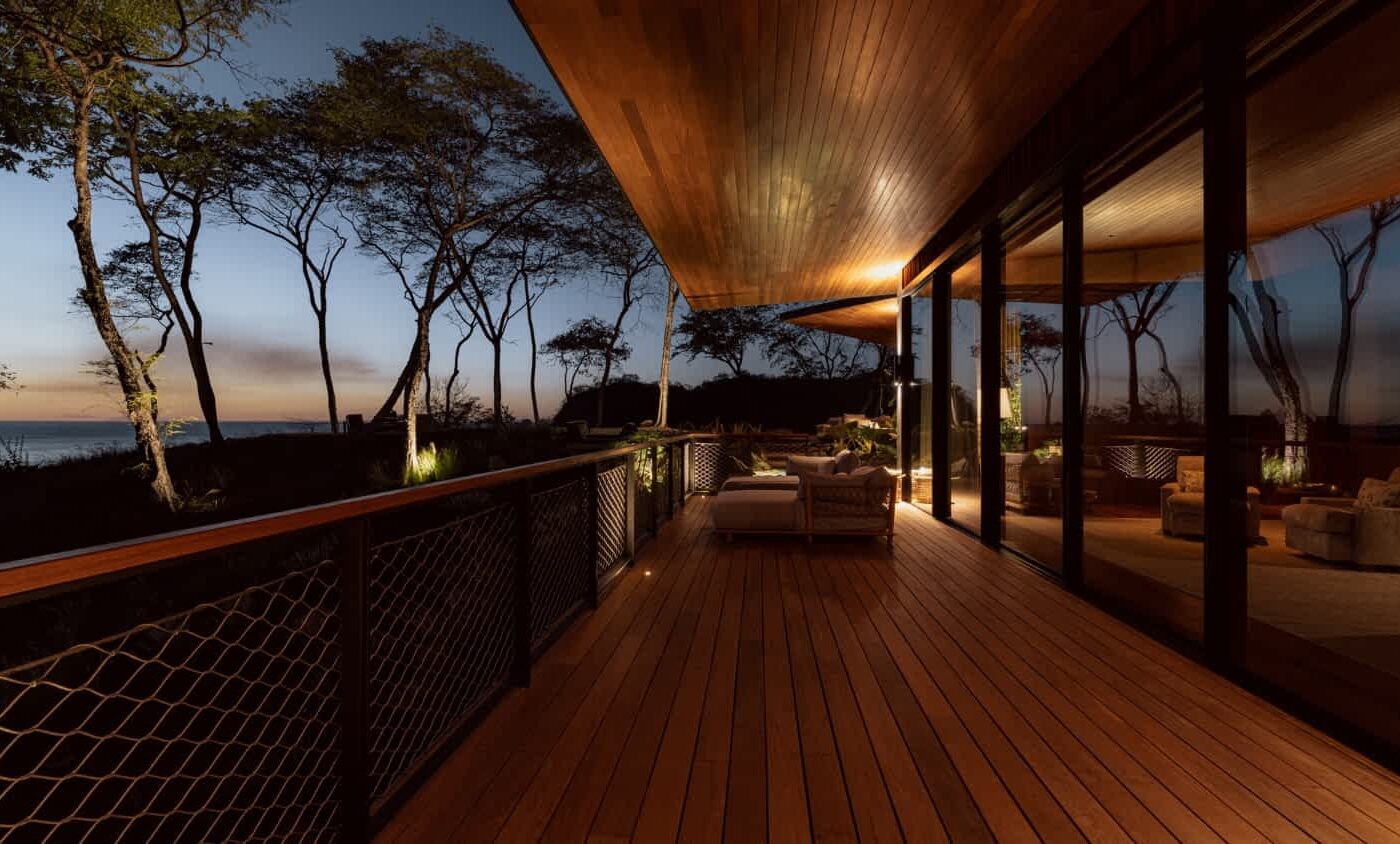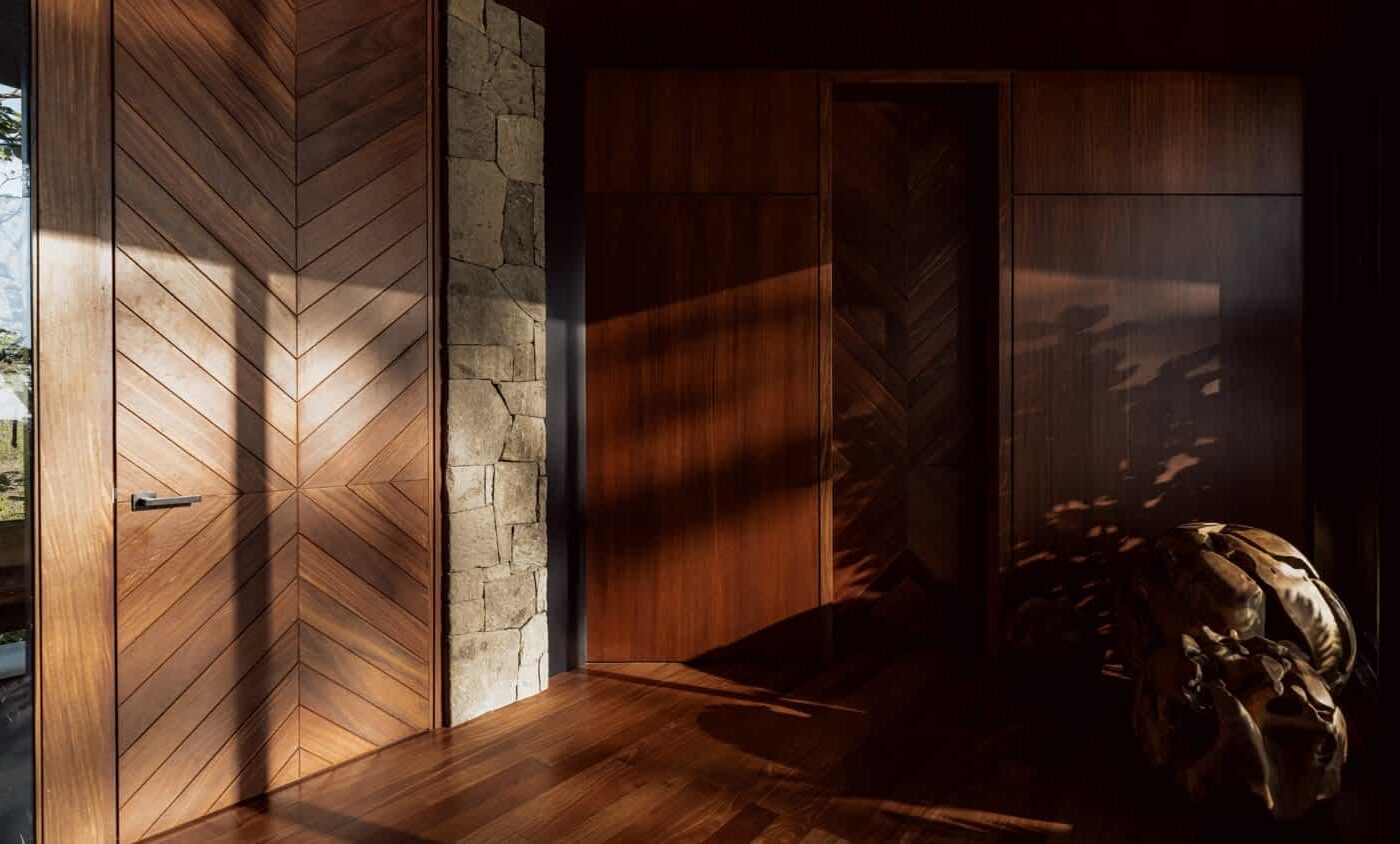 Premium materials are central to the project’s identity. Rich timber ceilings and bespoke wall cladding introduce warmth and tactility, while natural stone and dark metal accents provide weight, contrast, and permanence. These materials are not decorative, but architectural—used to anchor the building to its setting and elevate everyday moments. The result is an interior atmosphere that feels calm and refined, seamlessly extending outward through expansive decks, walkways, and landscaped terraces into a cohesive, immersive living environment.