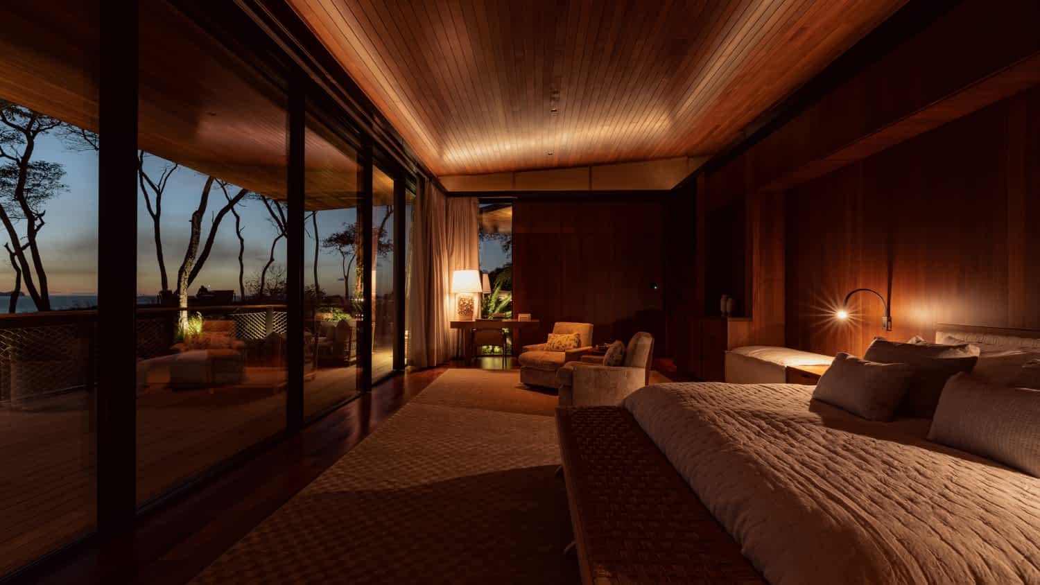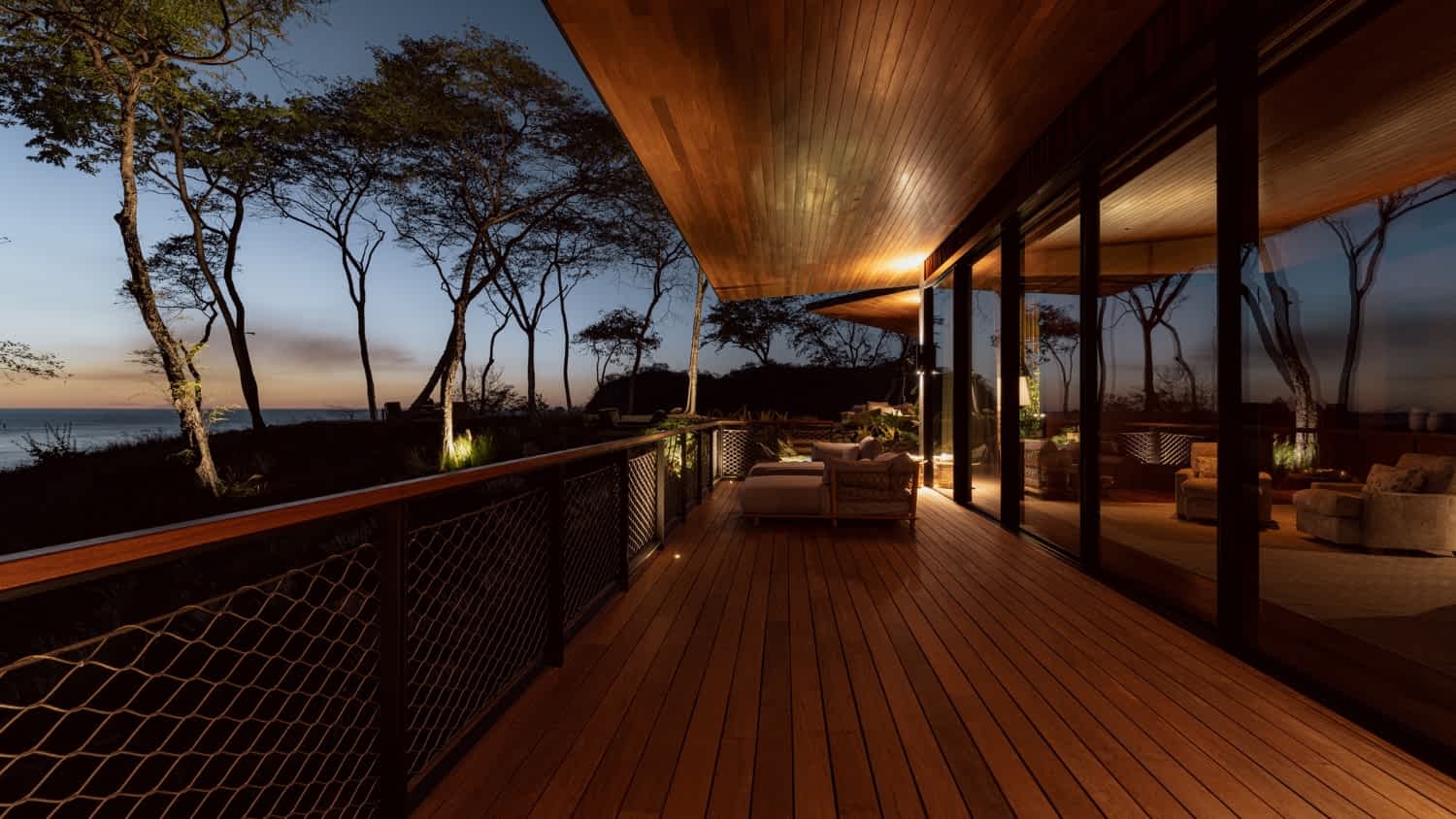 Premium materials are central to the project’s identity. Rich timber ceilings and bespoke wall cladding introduce warmth and tactility, while natural stone and dark metal accents provide weight, contrast, and permanence. These materials are not decorative, but architectural—used to anchor the building to its setting and elevate everyday moments. The result is an interior atmosphere that feels calm and refined, seamlessly extending outward through expansive decks, walkways, and landscaped terraces into a cohesive, immersive living environment.